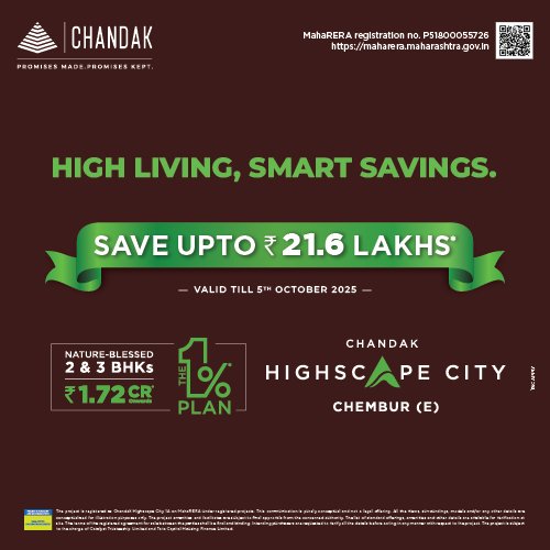 Chandak Highscape City in Chembur East is a landmark residential address offering smartly planned 1, 2 and 3 BHK homes with a perfect balance of modern living and natural serenity. Spread across a lush green campus, the project brings over 45 lifestyle amenities along with seamless connectivity to BKC, Eastern Freeway, monorail and express highways, making it one of the most desirable destinations in Mumbai.